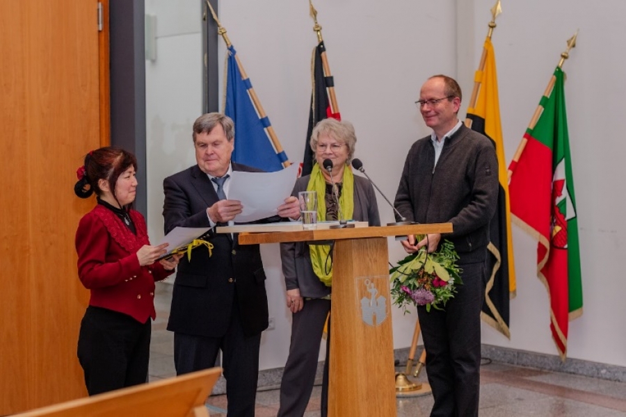 Sie hatte 18 der insgesamt mehr als 60 Benefizkonzerte für die neue Synagoge organisiert und in ihnen stets mitgewirkt. Mit großem Elan hat sie dies zusammen mit vielen Kolleginnen und Kollegen der Magdeburgischen Philharmonie zu Wege gebracht. Dieses intensive Engagement wurde ausführlich und anschaulich durch die Laudatorin, Frau Dr. Gabriele Köster, Direktorin der Magdeburger Museen, gewürdigt. Atsuko Koga bedankte sich mit einem meditativen Flötenkonzert eines japanischen Künstlers, ihrem „Gebet für die Neue Synagoge“. Die sehr gut besuchte Veranstaltung endete mit vielen Gesprächen und Begegnungen bei einem kleinen Imbiss.