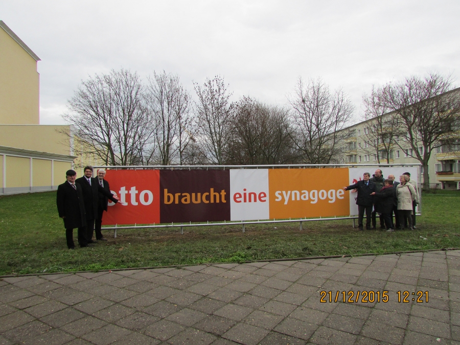 „Otto braucht eine Synagoge“ – dieser Satz ist auf einem Banner zu lesen, das am 21. Dezember 2015 auf dem für die Synagoge geplanten Grundstück in der Julius-Bremer-Straße 3 (zwischen Ratswaagehotel und Weitlingstraße) angebracht wurde.