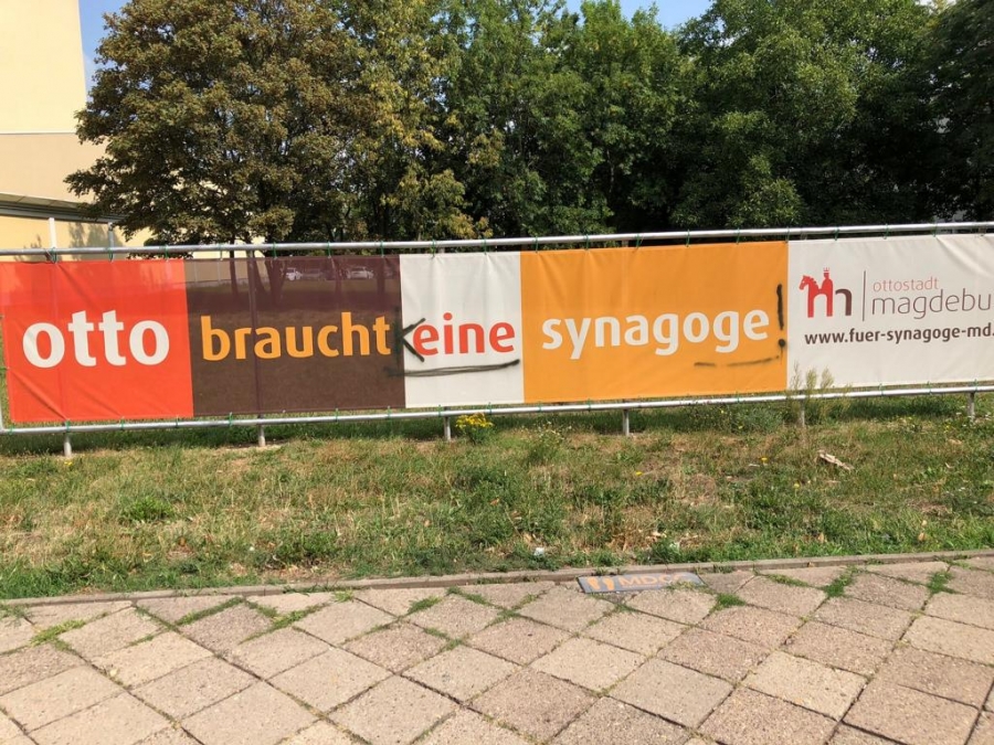 „Otto braucht eine Synagoge“ – acht Monate nach der 3. Zerstörung des Banners, das der Förderverein am zukünftigen Standort der Magdeburger Synagoge anbrachte, wurde dies Banner wieder beschädigt, diesmal durch eine Schmiererei mit wieder deutlich antisemitischem Charakter. Das ist auf das Schärfste zu verurteilen. Es zeigt, dass es auch in Magdeburg immer wieder nötig ist, gegen Antisemitismus vorzugehen und Zeichen zu setzen!